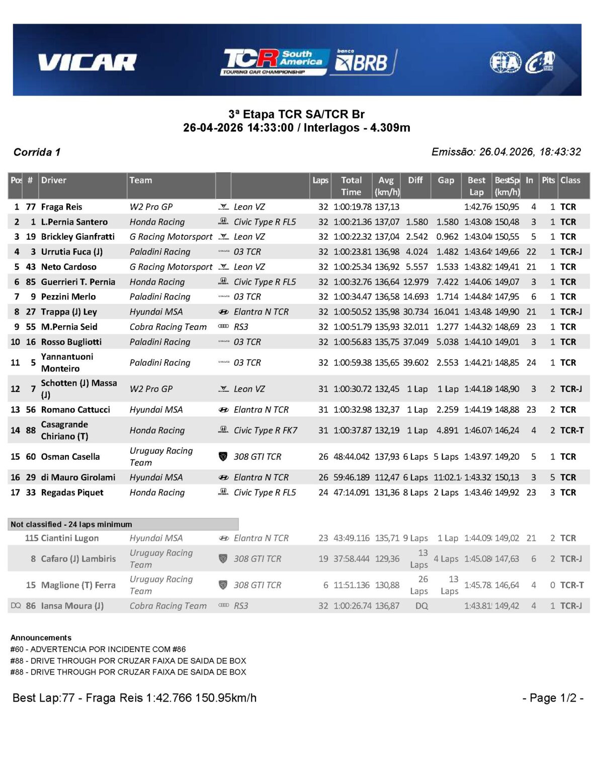 A dos minutos del final, el auto de seguridad se desplegó por un accidente de Juan Manuel Casella, compactando el pelotón. Reis, al mando, volvió a gestionar la presión y cruzó primero la bandera a cuadros con 1.580 segundos de margen sobre Pernía y Julián Santero en el Honda #1, y 2.542 sobre Enzo Gianfratti y Brickley en el Cupra #19 del G Racing Motorsport.
