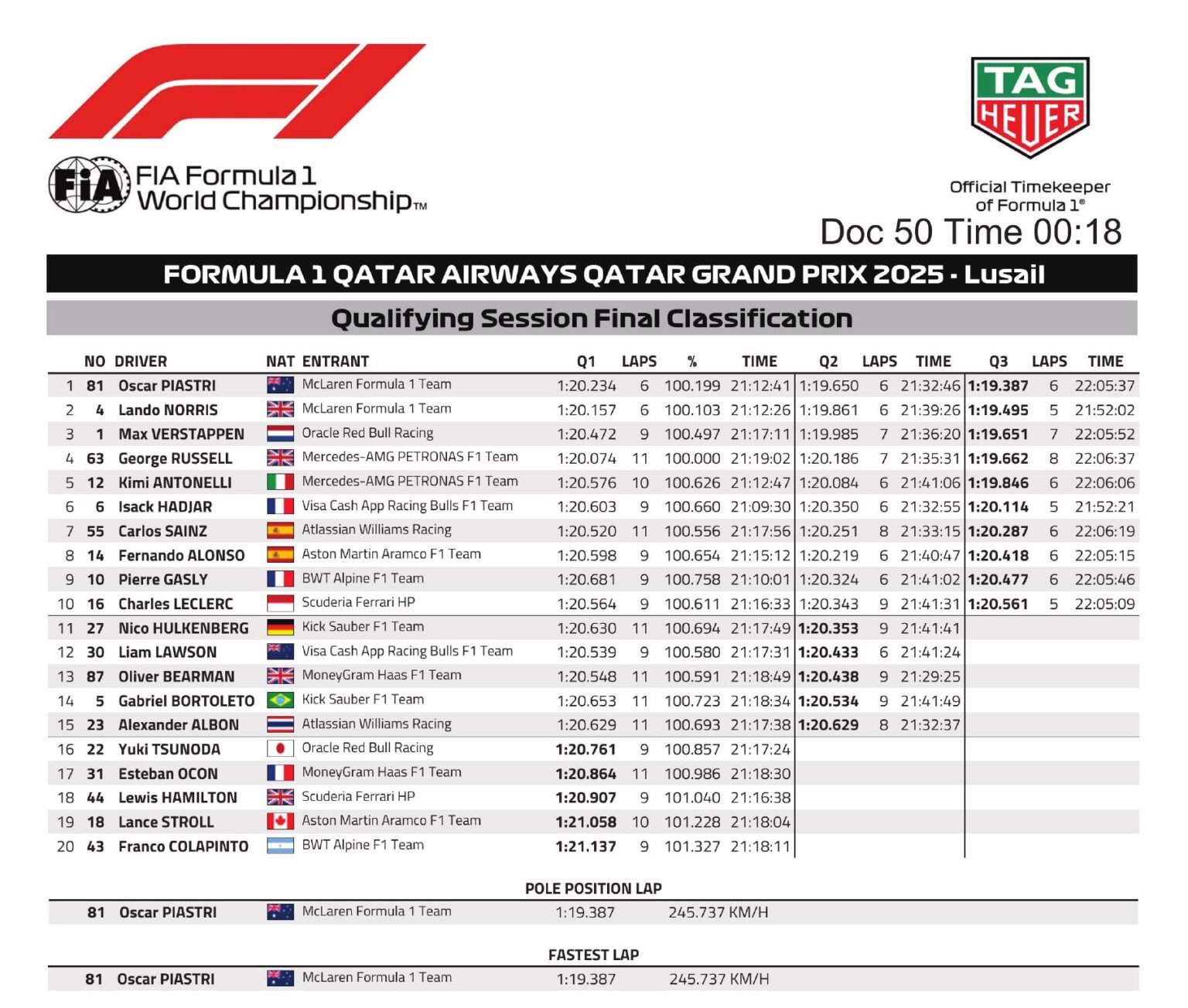 Grilla de partida del GP de Qatar 2025
