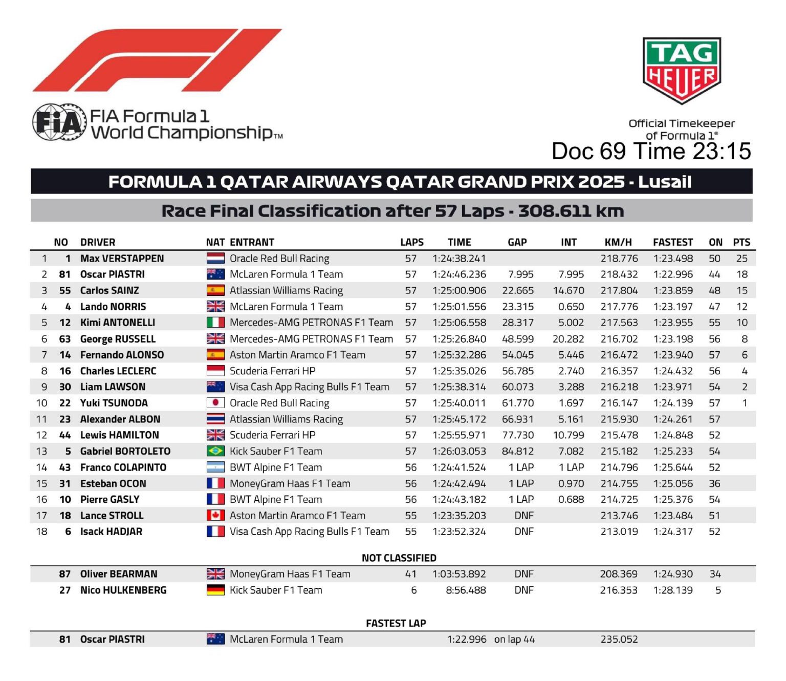 La victoria llegó con tiempo de 1:24:38.241 en 57 vueltas, estableciendo un promedio que reflejó un control absoluto desde la resalida. Verstappen registró 218.776 km/h de velocidad promedio, consolidando su séptima victoria de la temporada 2025 y reduciendo la distancia con Norris a apenas 12 puntos para el desenlace en Abu Dabi.