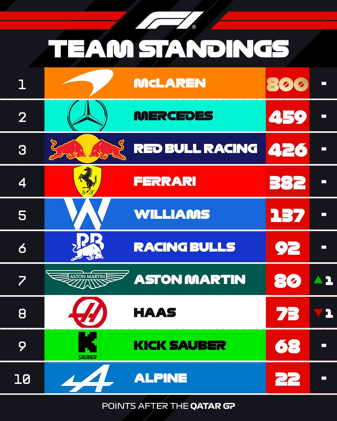 La clasificación de constructores refleja también las consecuencias: McLaren sigue siendo el equipo líder con 800 puntos, Mercedes asciende a 459, pero Red Bull se sitúa a 373 puntos de diferencia, persiguiendo activamente después de que parecía fuera de competencia hace apenas tres meses cuando RedBull estaba 104 puntos atrás.