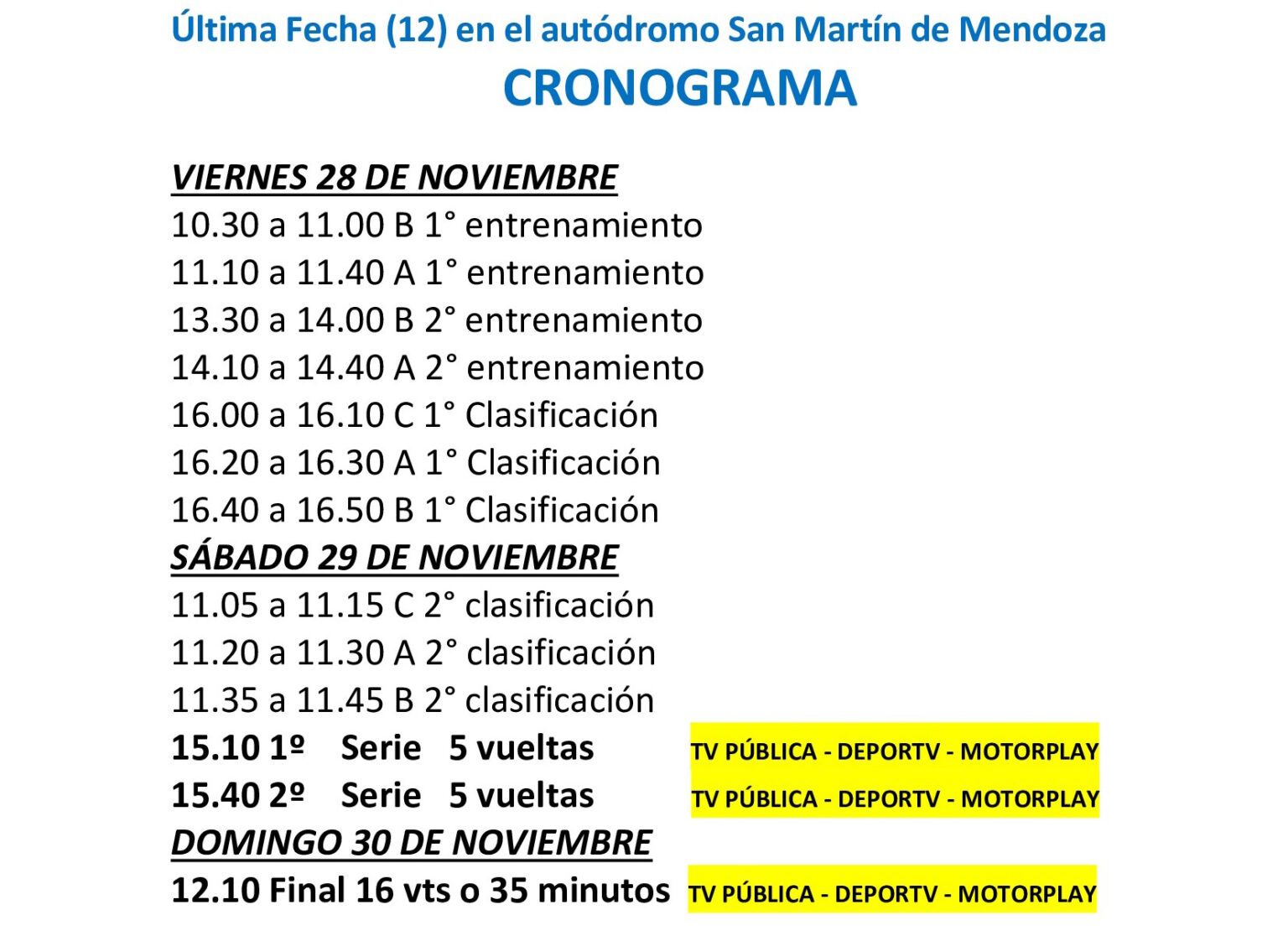 El fin de semana se distribuirá en las habituales tres jornadas. El viernes se abrirá con entrenamientos y la primera clasificación. El sábado concentrará la segunda clasificación y las series, fundamentales para la posición de largada. Finalmente, el domingo se correrá la final, que definirá los puntos claves para la recta decisiva del torneo.