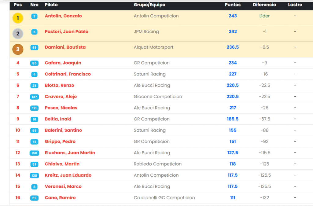 Con los puntos sumados en San Juan, Cafaro lidera el campeonato con 101 unidades, seguido muy de cerca por Damiani (100) y Posco (95). La consistencia y madurez de manejo que demostró en un escenario exigente lo posicionan como uno de los grandes protagonistas rumbo al título. 🏎️🔧
